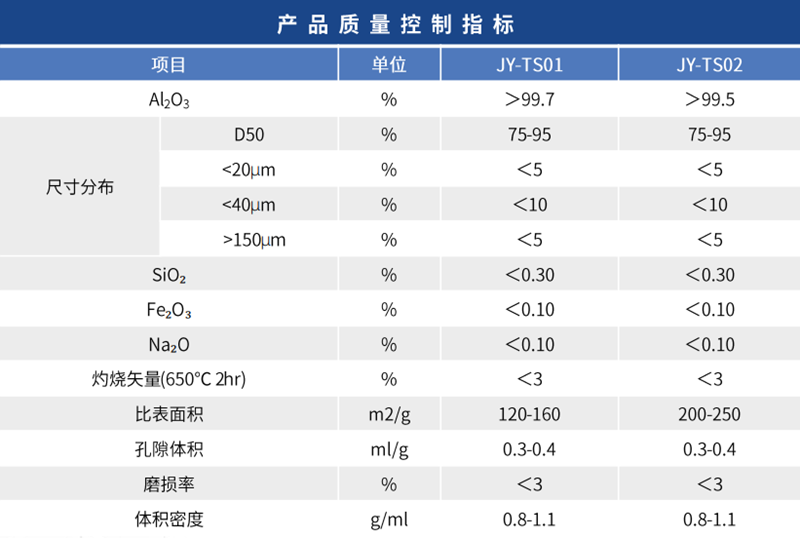 晶型:γ-Al2O3 物理性質(zhì):本品無(wú)毒、無(wú)味、無(wú)嗅、不溶于水和乙醇。 產(chǎn)品簡(jiǎn)介:JY-TS脫氫催化劑載體具有低磨損、粒徑分布集中等特點(diǎn),產(chǎn)品粒徑分孔容、比表面積等指標(biāo)可根據(jù)要求調(diào)整,通常用于流化床。